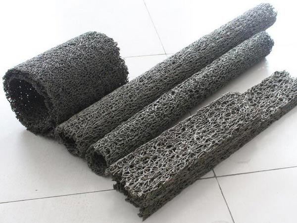 塑料盲溝是由塑料芯體外包裹濾布組式。塑料芯體是以熱可塑性合成樹脂為主要原料,經(jīng)過改性,在熱熔狀態(tài)下,通過噴咀擠壓出細的塑料絲條,再通過成型裝置將擠出的塑料絲在結(jié)點上熔接,形成三維立體網(wǎng)狀結(jié)構(gòu)。